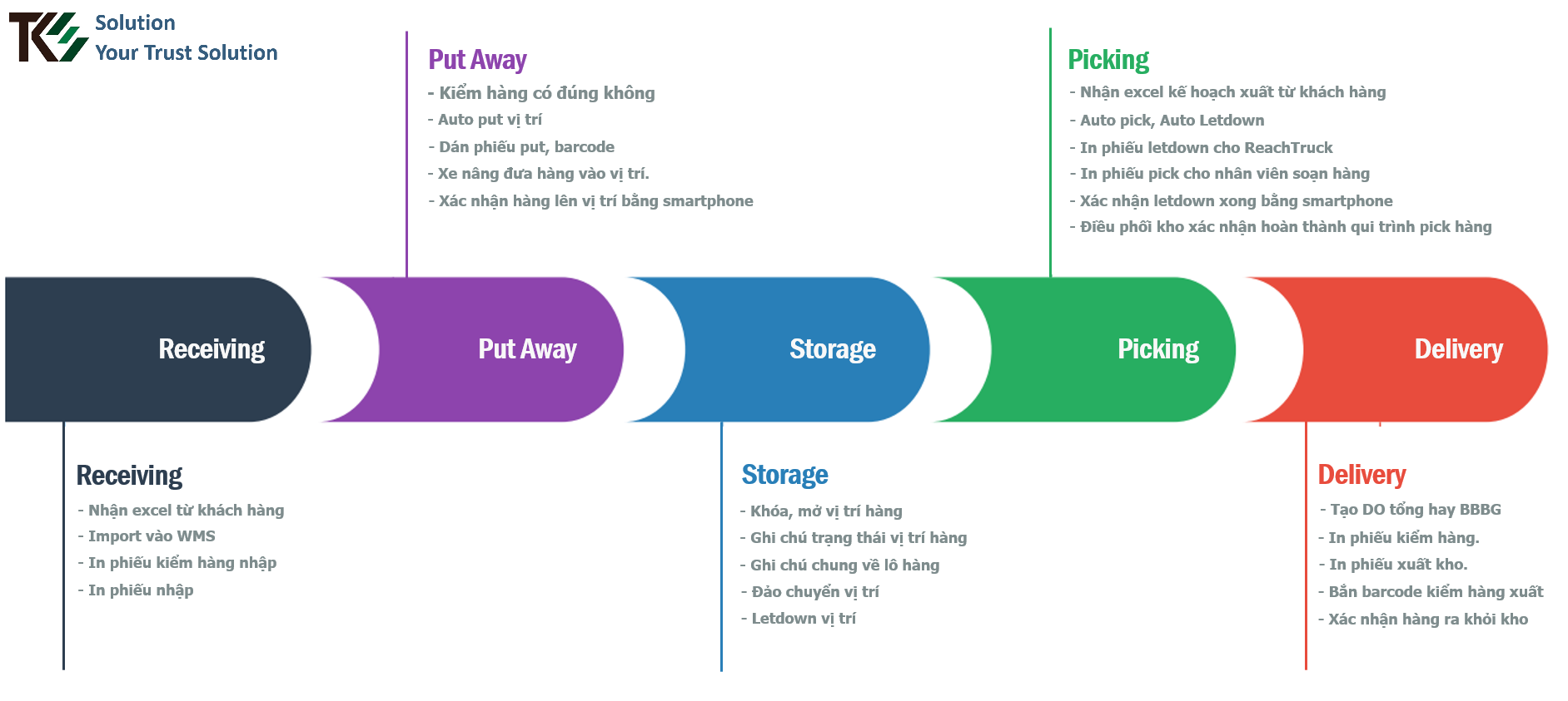 Nhìn mô hình vận hành WMS phía dưới là hiểu liền. Chủ yếu ở đây là vấn đề hiệu suất, năng suất xử lý kho, ERP khó có thể làm linh động như WMS, nếu có thể thì cũng sẽ làm ERP rất rườm rà, customize rất nhiều.