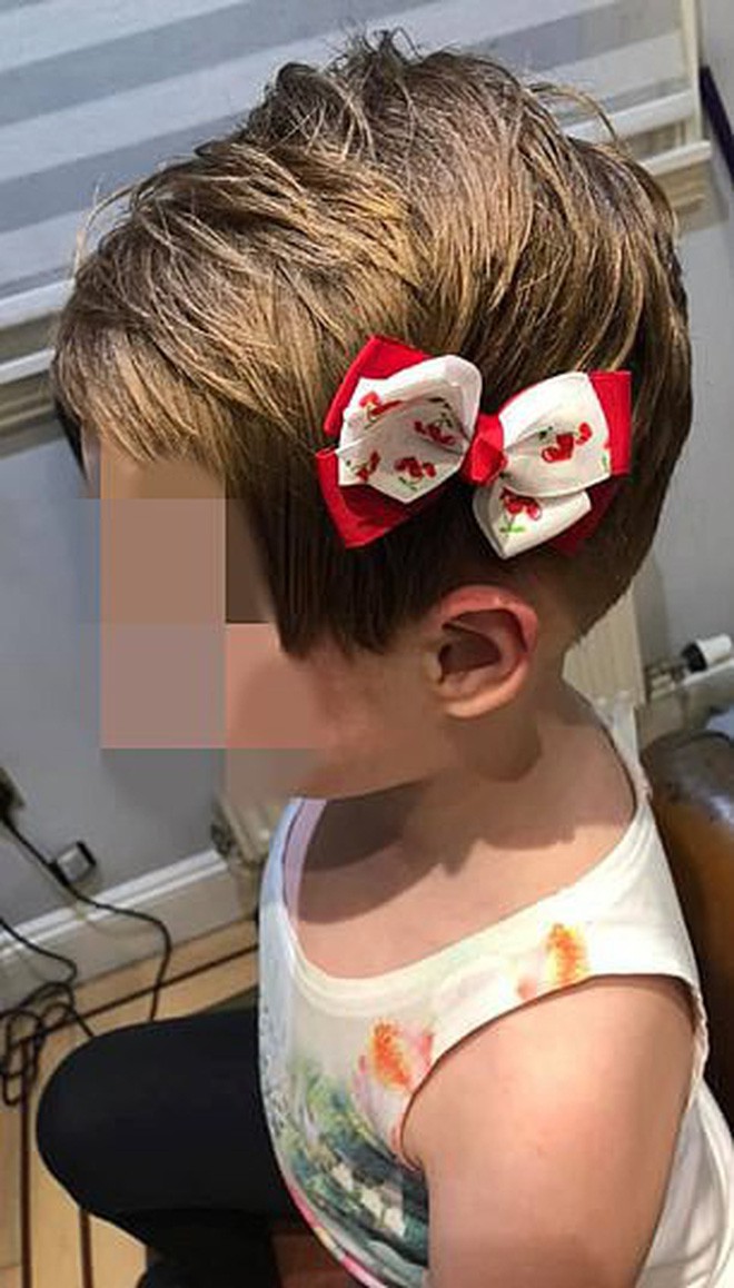 Bé gái trước và sau khi được tiệm tóc sửa lại phần bị cắt (bằng cách cắt ngắn toàn bộ).